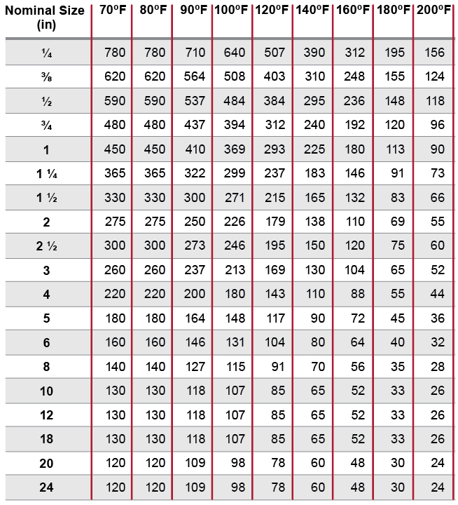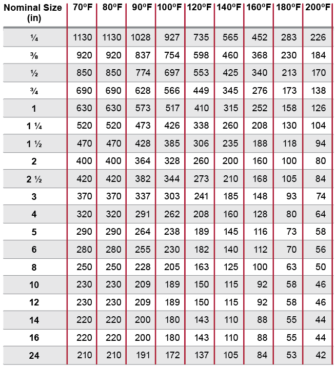Corzan시스템압력등급은파이프원료, 파이프두께, 파이프크기및운전온도에 따라 다릅니다. CPVC 4120-05 Schedule 80 및 40 파이프의 Corzan 내부압력등급과파괴 압력등급은 아래와 같습니다.