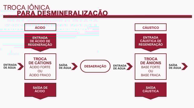 Os sistemas de troca iônica são projetados para remover íons de cálcio e magnésio dá água de alimentação. O processo inclui duas trocas separadas: uma troca de cátions e troca de ânions.