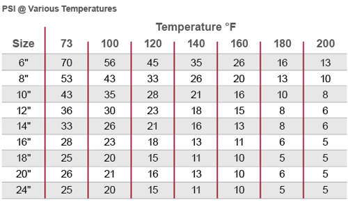 Os tubos da Corzan® CPVC podem suportar níveis superiores de pressão interna positiva do que a pressão interna negativa. A tabela abaixo (imagem 2) mostra a classificação de pressão interna máxima recomendada em PSI para o CPVC Corzan® (tubo circular extrudado) em diferentes temperaturas ambiente.